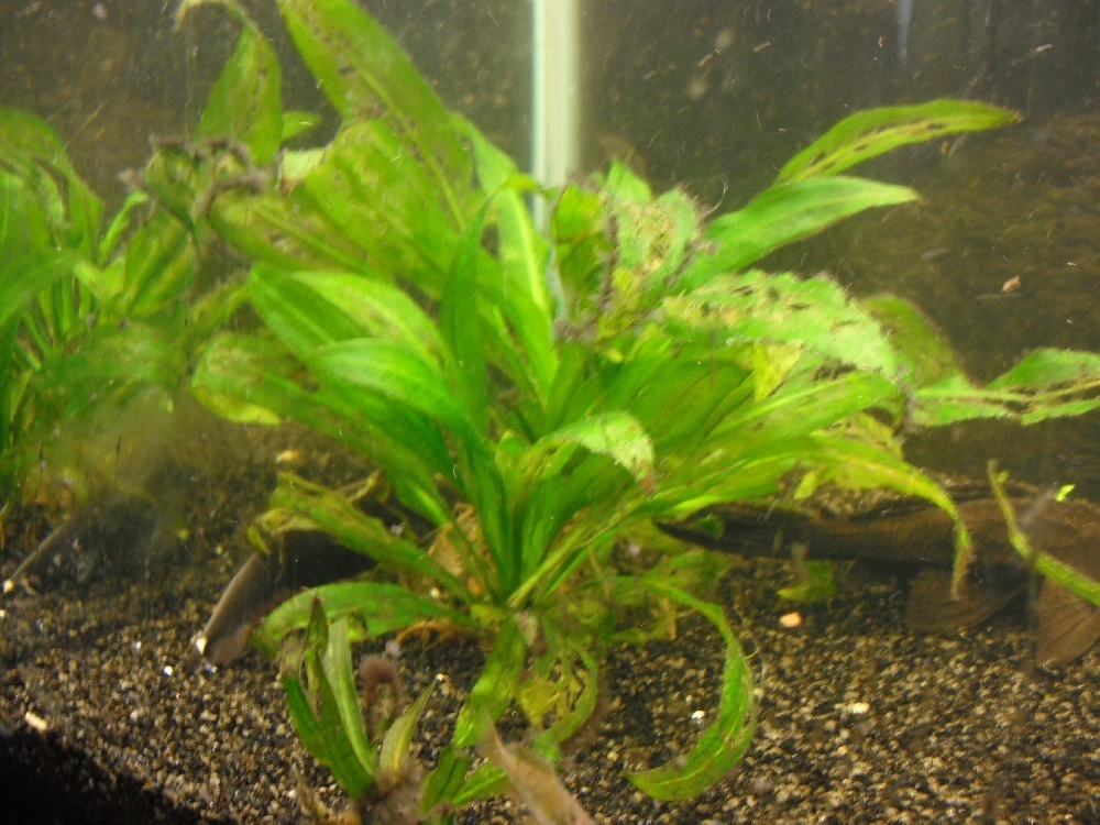 Вариант первый и не фатальный. Многие аквариумные растения по сути своей болотные и выращивают их на суше в очень влажных местах или полупогруженными в воду. О том, как отличить такие растения от выращенных под водой рассказано в отдельном материале. В принципе, сажать полностью под воду надводные формы аквариумных растений вполне можно, но им потребуется время для адаптации к новым условиям. Поэтому нельзя ожидать от них незамедлительного и бурного роста. Напротив, сначала может показаться, что такое растение погибает. Например, выращенные на суше эхинодорусы в течение первого месяца жизни в аквариуме меняют все листья.