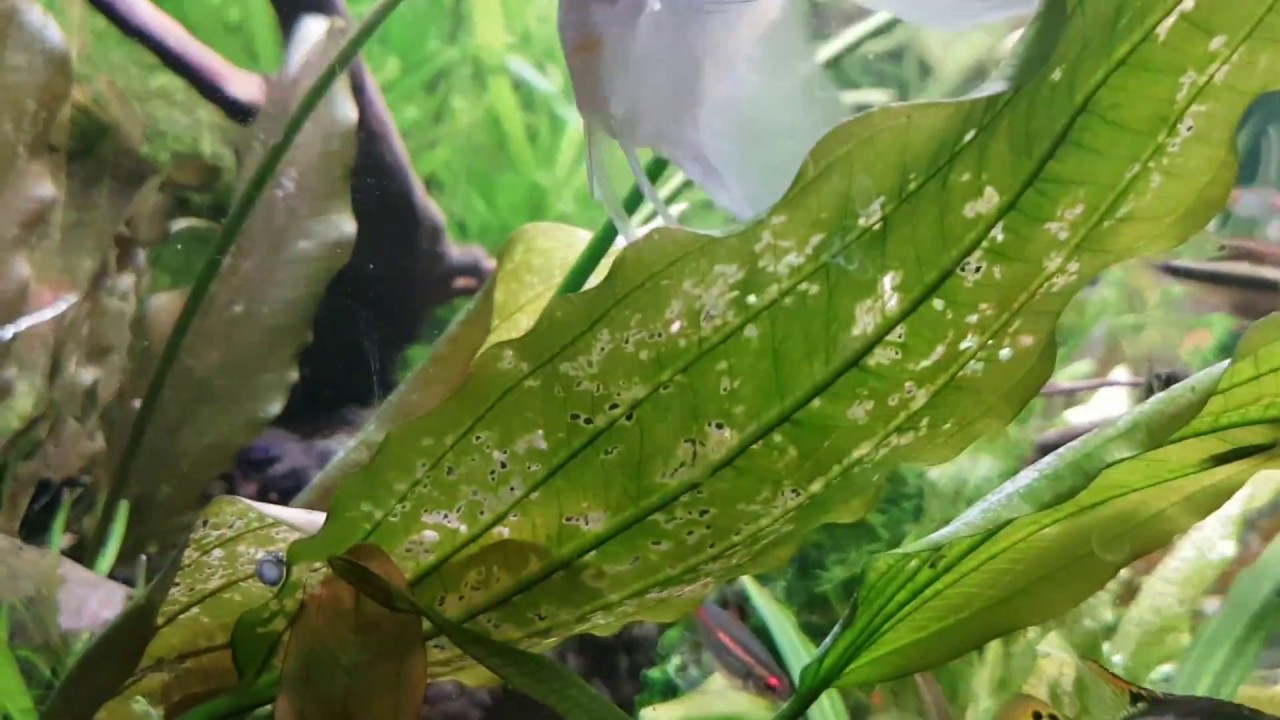 Недостаток калияРаспространенный симптом дефицита калия — небольшие проколы на листьях аквариумных растений.