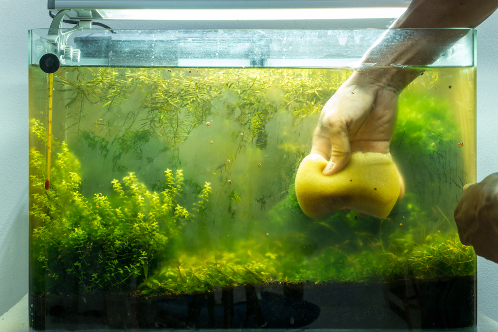 Используйте скребок, чтобы удалить как можно больше водорослей с стенок аквариума. Ничего страшного, если это немного взбодрит.