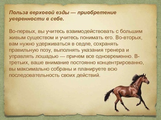 Считается также, что регулярные занятия верховой ездой очень полезны неуверенным в себе людям, так как способствуют стойкому повышению самооценки.
