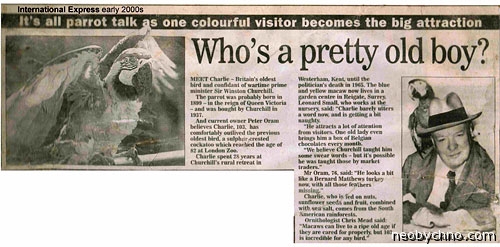 А теперь вот еще, ко всему прочему, объявился доселе неведомый миру черчиллевский попугай. И, понятное дело, непростой, а золотой по своей раскраске, древний, как Муфусаил, характером вздорный и ругачий, как сапожник. Откуда взялся? Пышная оперением птица по имени Чарли, ста четырех годов от роду, как утверждает ее нынешний опекун Питер Орэм — владелец магазина домашних животных и садового центра в английском Рейгейте (графство Суррей), досталась ему в 1965 году после смерти хозяина попугая, Уинстона Черчилля.
