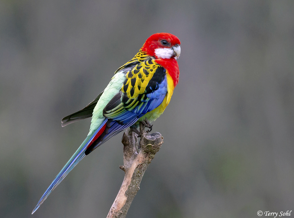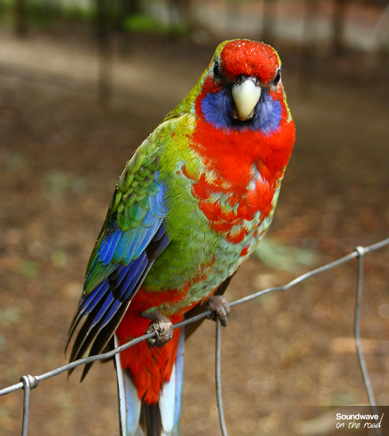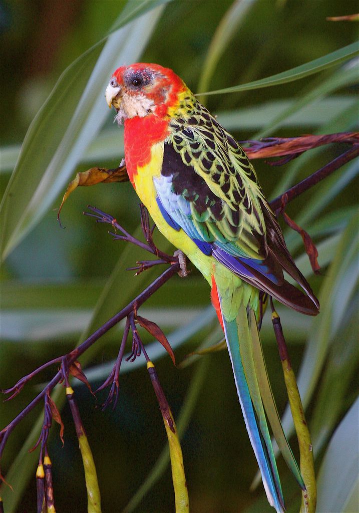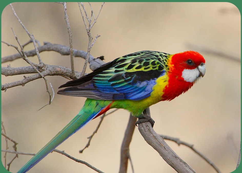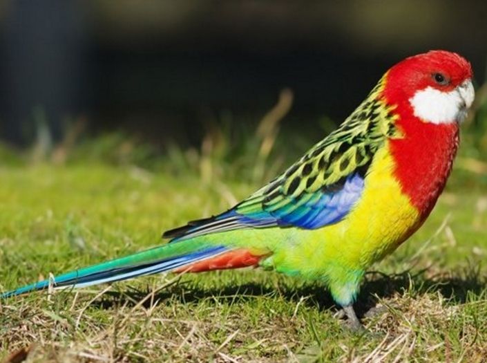 Красная розелла (Platycercus elegans). Грудь и голова птицы красные, щеки – бело-голубые. Оперение на животе зеленоватое, верхняя часть спины – черная. Маховые перья на крыльях – синие, остальные – черные с зеленым. Перья на хвосте – белые с зеленым. Длина тела составляет 33-36 сантиметров, окрас самцов и самок не отличается. Естественная среда обитания – юг и восток Австралии.