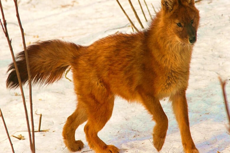 Красный волк — вид, вобравший внешние признаки не только серого, но и шакала с лисой. О последней напоминает красный цвет меха и его длина на спине и боках хищника. К тому же, у волка узкая мордочка, как и у рыжей плутовки. Длинный, пушистый хвост красного хищника тоже напоминает лисий. Строение же тела ближе к шакальему, такое же поджарое.