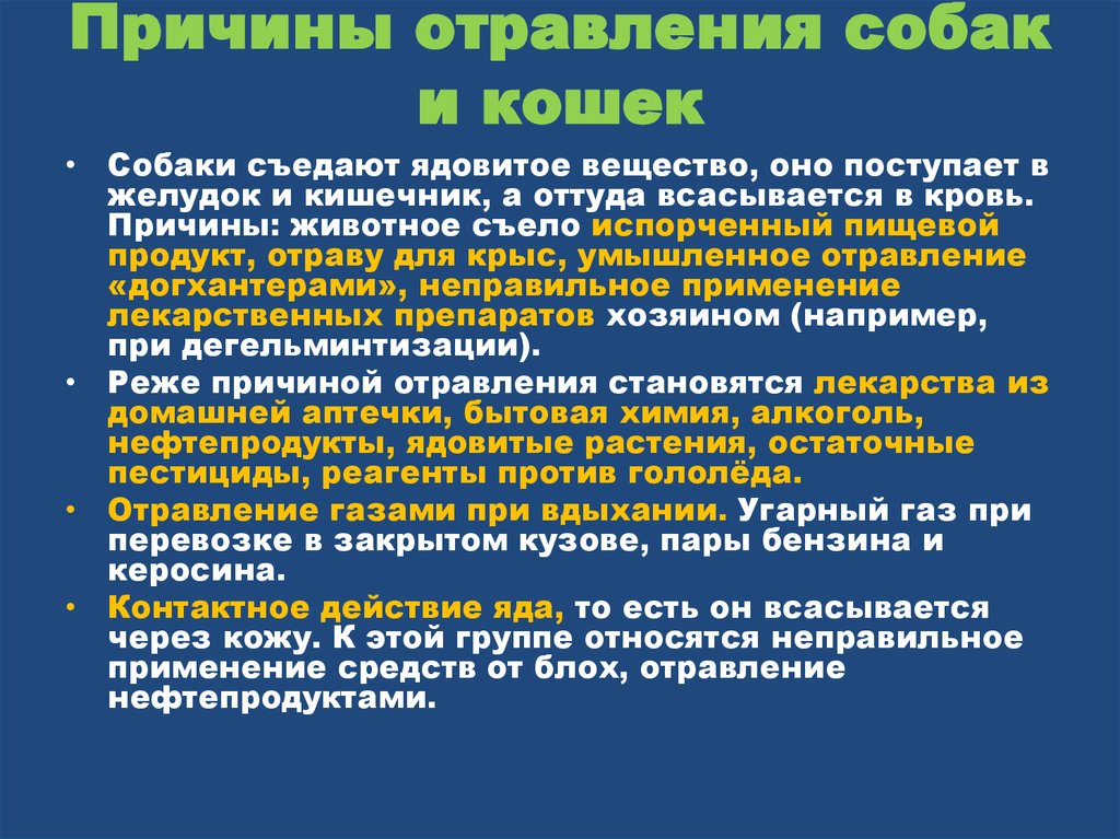 Кошка может отравиться по своей вине или из-за человека, в том числе и хозяина. Различают отравление острое, происходящее из-за разово принятой животным большой дозы яда, и хроническое, из-за долгого поступления его небольших доз в организм.