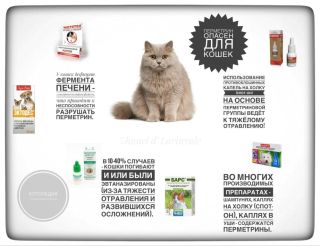 Это обычные лекарства от блох и клещей, которые вы можете найти в своей ветеринарной клинике или в местном зоомагазине (например, Hartz ™, Sergeants ™). Обычно они содержат высокие концентрации химического вещества, полученного из цветка хризантемы . Хотя очень безопасны для собак , пиретрины или пиретроиды очень токсичны для кошек. Случайное отравление кошек обычно происходит, когда владельцы домашних животных применяют инсектициды для собак или когда кошки слизывают лекарства с собак. Урок, который нужно усвоить? Всегда читайте мелкий шрифт и никогда не наносите лекарства от блох и клещей для «маленьких собак» на «большую кошку», не посоветовавшись предварительно с ветеринаром! Если кошки подвергаются воздействию концентрированных инсектицидов, это может привести к сильному тремору, судорогам, гипертермии и смерти при отсутствии лечения. Если вы случайно нанесете его на кошку, вымойте его жидким мылом для посуды (используемым для мытья посуды в раковине, например, Dawn ™) и немедленно обратитесь к ветеринару.