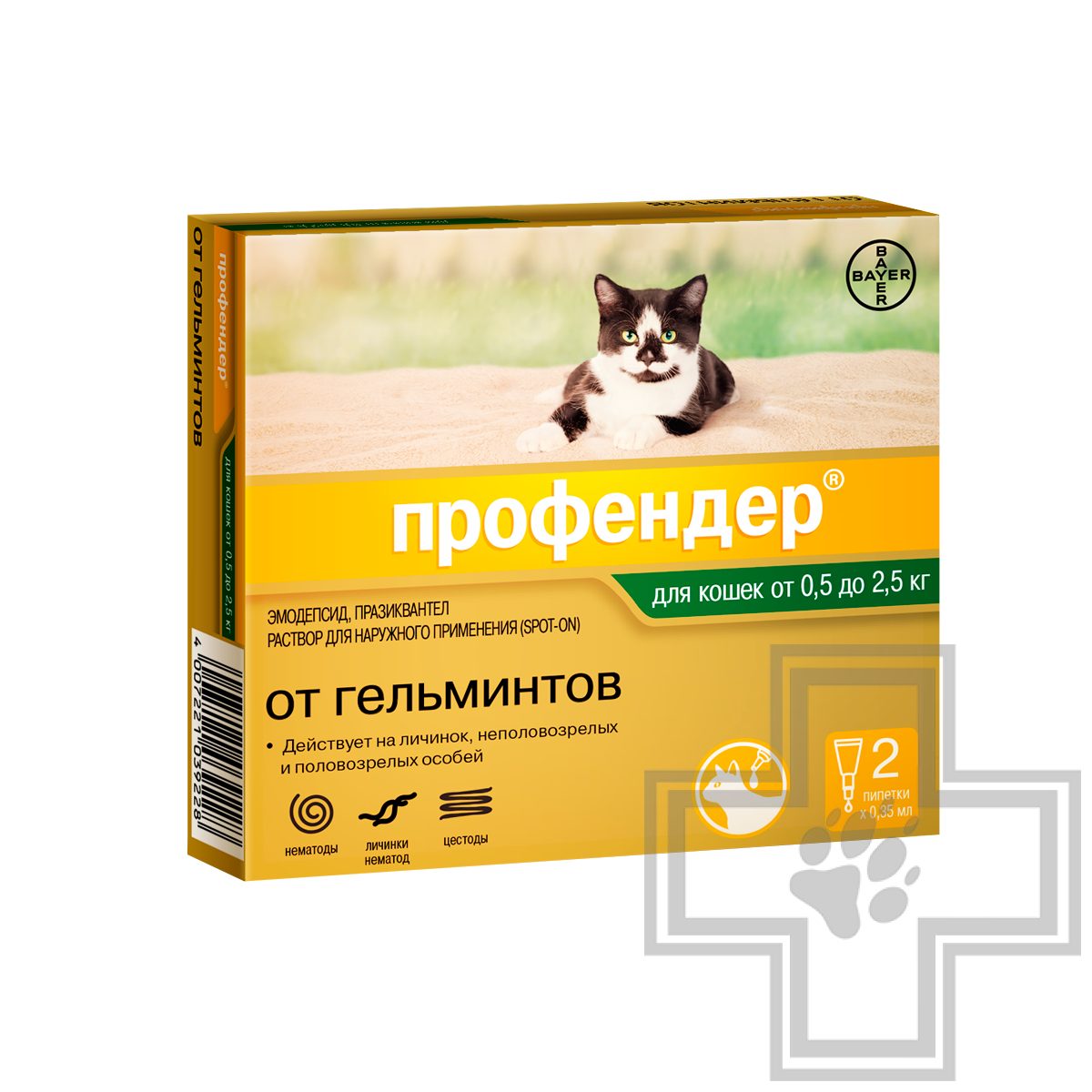 Profender Cat Dewormer — это требуемый по рецепту раствор для местного применения, одобренный FDA для лечения и контроля анкилостомоза, аскарид и ленточных червей у кошек в возрасте 8 недель и старше и весом не менее 2,2 фунта. Profender Cat Dewormer упакован в тюбики-аппликаторы с разовой дозировкой и доступен в виде тюбиков объемом 0,35 мл, содержащих эмодепсид 7,5 мг и празиквантел 30 мг, для применения у кошек весом 2,2–5,5 фунта, а также в тюбиках объемом 0,70 мл, содержащих эмодепсид 15 мг и празиквантел 60,1 мг, для применения у кошек. 5,6-11 фунтов и 1,12 мл пробирки, содержащие эмодепсид 24 мг и празиквантел 96,1 мг для кошек весом 11,1-17,6 фунтов.