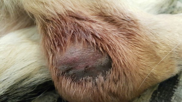 При отсутствии лечения и продолжении сдавливания происходит выпадение шерсти и уплотнение кожи в поражённой области, место пролежня у собаки становится влажным и достаточное горячим на ощупь.