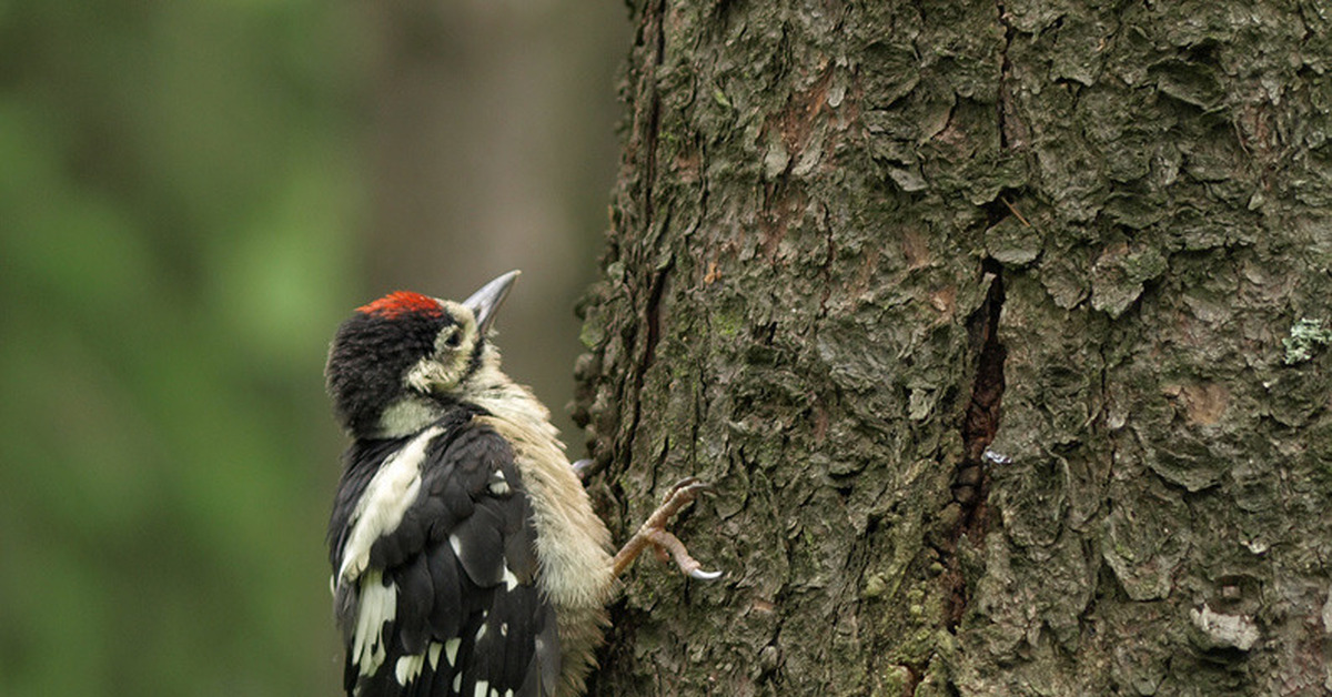 Большой пестрый дятел (Dendrocopos mayor). Птица несколько крупнее скворца (масса тела самцов 70-96 г, самок 70-97 г). Верх головы и шеи, спина, крылья, надхвостье, хвост у него черные, такого же цвета полоса от клюва до затылка, ограничивающая белые щеки; лоб, горло, грудь, брюшко, пятна на плечах, полоски на крыльях и хвосте белые.