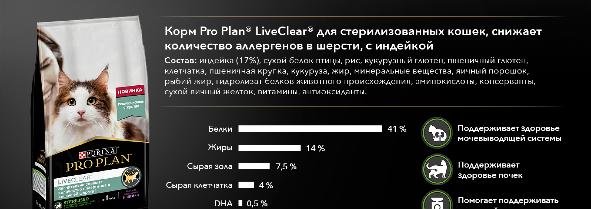 Он разработан на основе природного рациона кошек, содержит диетический белок для поддержания идеального физического состояния стерилизованного животного. Минеральные вещества поддерживают нормальную работу почек и мочевыделительной системы, а натуральные антиоксиданты из фруктов и трав обладают очищающими и противовоспалительными свойствами.