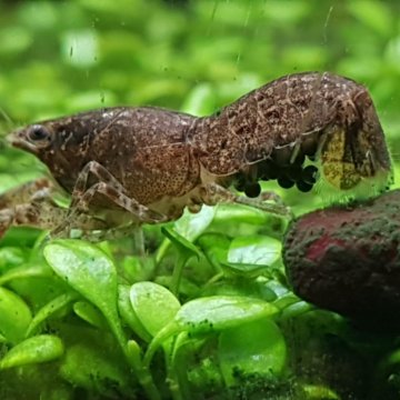 Карликовые раки не являются долгожителями, живут – 1,5-2 года, впрочем, есть информация и о более долгой жизни. Так что, если вам понравились эти существа, придется подумать над их разведением. Раки раздельнополые существа. Самцы мельче самок, имеют более мощные клешни и на одном из брюшных сегментов имеют совокупительный аппарат – видоизмененную пару конечностей. Размножение раков не требует вмешательства аквариумиста. Спаривание происходит сразу же после линьки. Затем на брюшке у самки, на плавательных ножках, становятся заметны гроздья яиц. Они довольно крупные непрозрачные легко заметные.