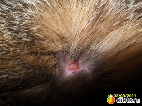 Экзема может образоваться на щеках, лапках и подушечках, на хвосте. Сначала в локализованном месте возникает покраснение, которое чешется и зудит. Вскоре на коже формируются маленькая папула, которая превращается в пузырек.