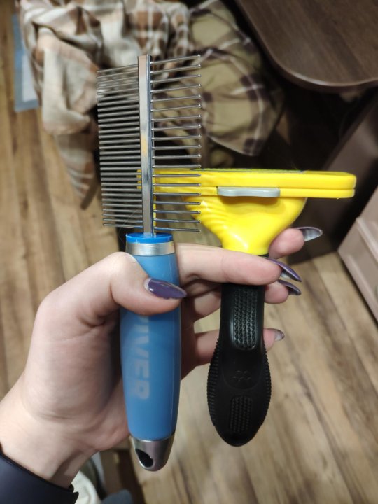 Инструмент с длинным лезвием — для расчесывания шубки на корпусе и бедрах, а щетка среднего размера — для обработки шерсти под хвостом, за ушами и в местах изгибов туловища. Декоративных собачек вычесывают граблями с самым маленьким размером лезвия.