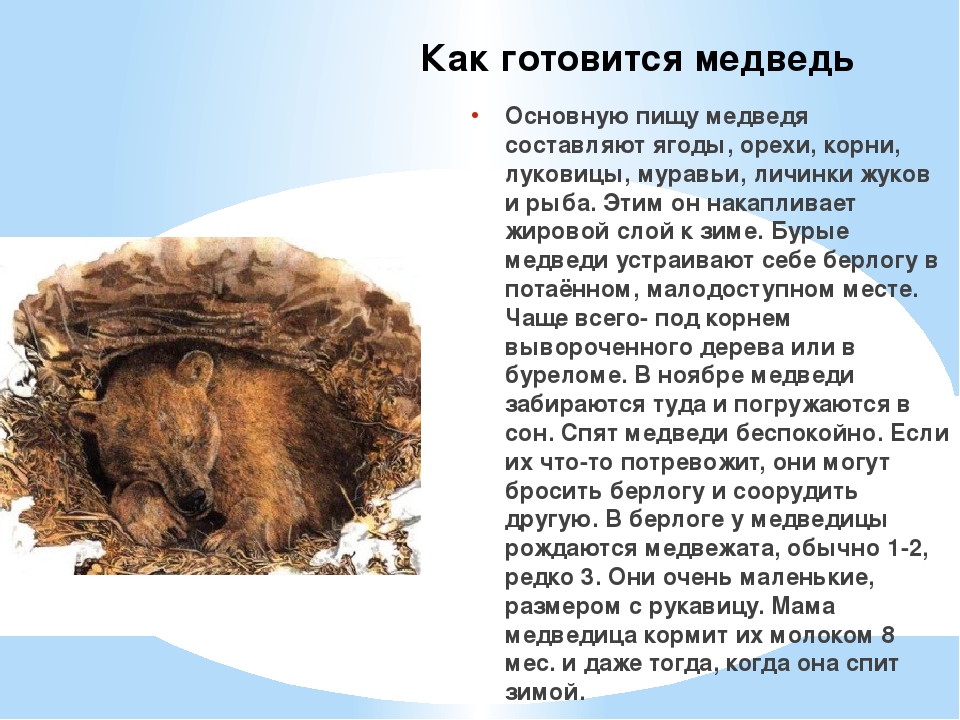 Они готовят себе постель изо мха и коры деревьев, в Сибири лесные великаны роют себе яму в труднодоступном месте (у болота, под корнем упавшего дерева), вход часто закрывает ветками, хворостом или мхом. Не забывают они оставить отдушину. Перед впадением в спячку наедают жиру. Там, где растут кедровые сосны, наедаются косолапые до отвала их орехами. Спит медведь вроде чутко, но того, что у него под носом не ощущает. Полевки, собирая сырье для своих гнезд, «выстригают» из шерсти бурого целые дорожки.