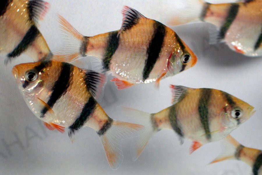 Бока украшены четырьмя вертикальными черными полосами. Иногда из-за этих полос их называют тигровыми. Есть разновидности с пятью полосами, к примеру: Barbus pentazona. Одна расположена на голове прямо по глазам, следующая — за грудным, третья — сразу за спинным плавниками, последняя – у основания хвостика.