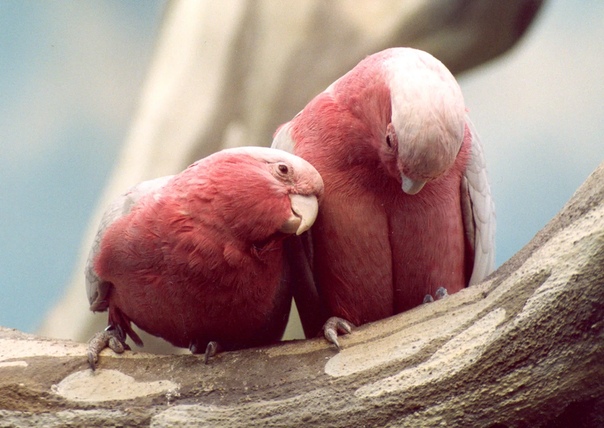 Во время дождя розовые какаду широко расправляют крылья и хвост, явно наслаждаясь водными процедурами. Нередко они висят вниз головой, уцепившись лапами за ветки, чтобы получить большее удовольствие.
