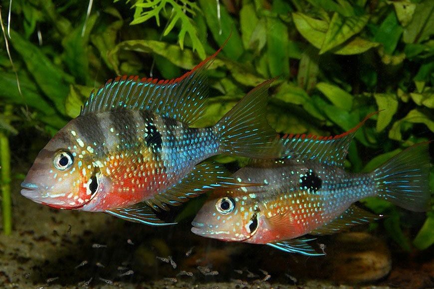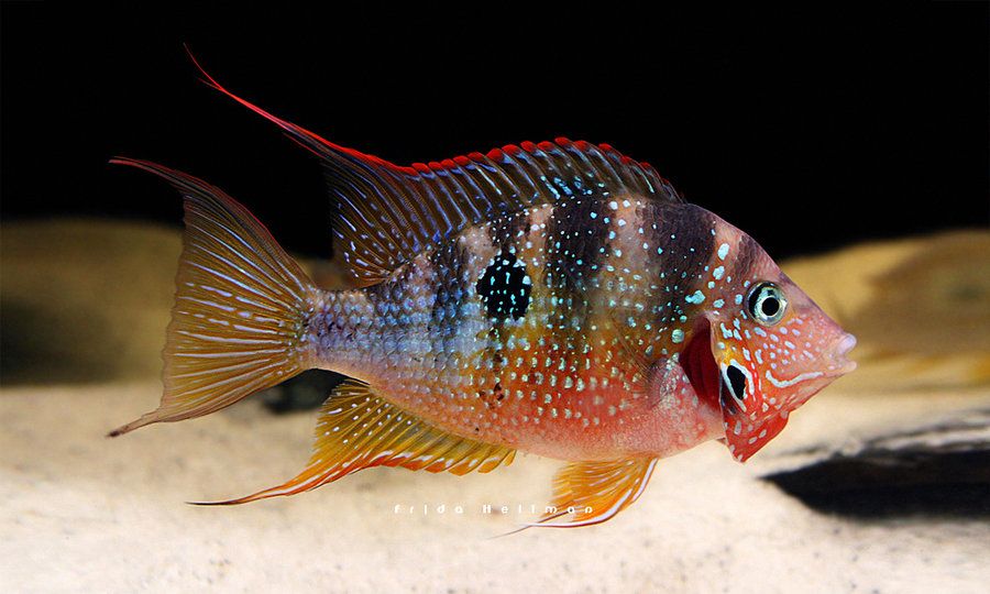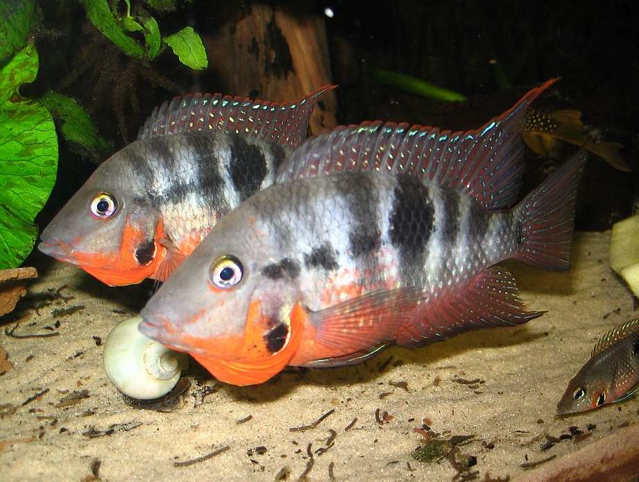 - Как и у большинства цихлид, нерестящихся в субстрате, взрослые особи являются отличными родителями, беря икру во рту, чтобы защитить ее от грибков, а затем усердно заботясь о детенышах. Молодняк можно выращивать почти так же, как и других производителей субстрата. Обычно они рождаются выводками численностью от 100 до 500 особей. Их необходимо часто кормить артемией науплиусами артемии , сваренным вкрутую яичным желтком или инфузориями в течение первой недели жизни. После этого им вместе с родителями можно давать мелкоизмельченный хлопьевидный корм и замороженный корм. Родители часто охраняют малышей в течение месяца, после чего малышей можно забрать из-под присмотра родителей и поместить в отдельный аквариум.