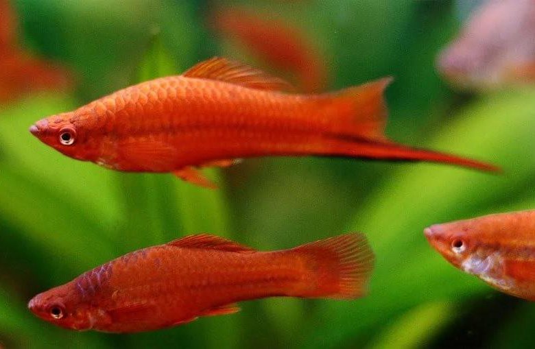 Цвет — полностью красный. Рыбки очень подвижные, поэтому им нужен простор для маневров (минимум 50 л). Идеальный вариант — густая растительность по периметру аквариума, посередине — место для свободного плавания. В подобном «помещении» с комфортом будет жить рыбья семейка на 10 особей. Температура должна быть в пределах 23-25°С, вода средней жесткости, можно добавлять щепоть соли. Замене подлежит треть воды.