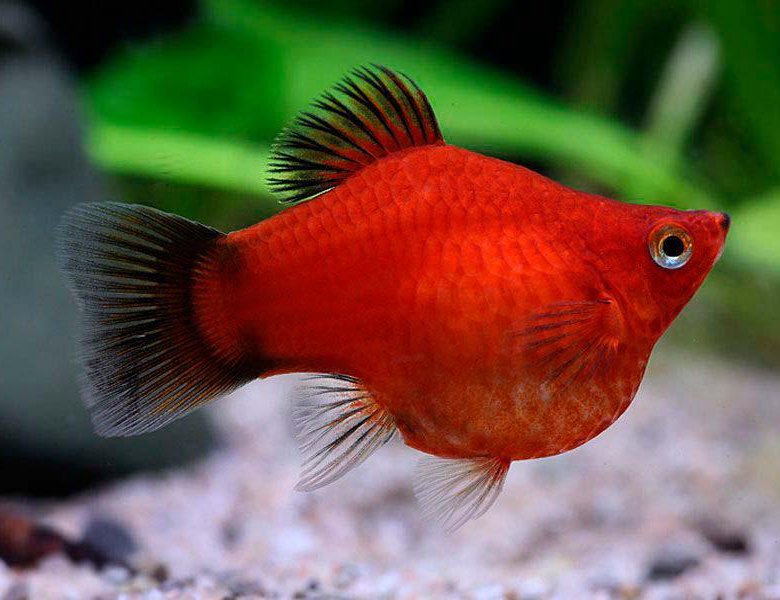 Селекционные рыбы имеют более яркий окрас, нежели существующие в природе. Название этих красных рыбок произошло от длинного выроста на нижнем плавнике, похожем на меч. Размер меченосцев — 10-12 см, причем самки крупнее самцов. Самый популярный облик этой рыбки — красная с черным хвостом.