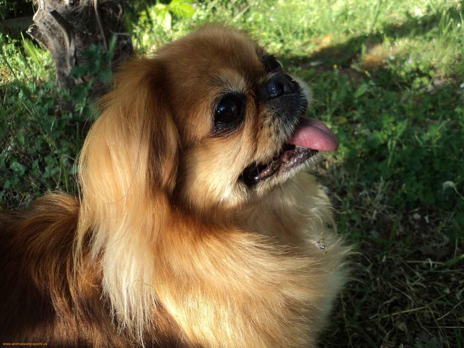 Профиль очень курносый. Шерсть длинная, прямая, не прилегает к телу. Очень пышная на шее и загривке, где получается «воротник». Признанный окрас пекинесов палевый, рыжий, черный, черно-подпалый, соболиный и белый. Также шерсть бывает двухцветная или разных оттенков. На морде обязательны маска и темная обводка глаз. Пекинес — очень хороший и преданный друг, но в то же время помнит причиненное ему зло или обиду. К детям относится сдержанно.