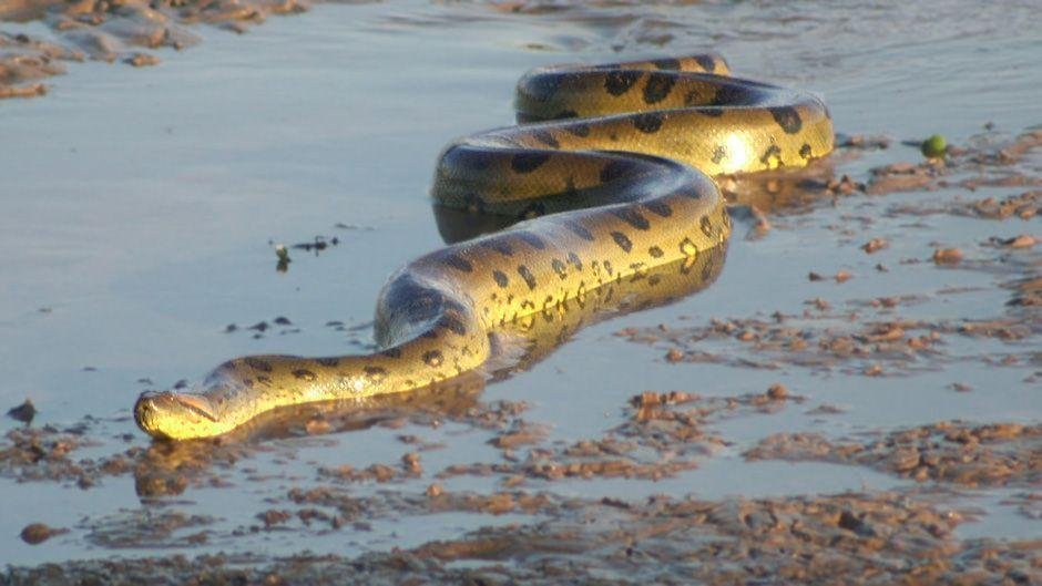 Болота и топи в тропических лесах являются излюбленным местом обитания зеленых анаконд. Они могут вырасти до более чем 22 футов в длину, а их вес может достигать 550 фунтов (227 кг) и более. Из-за своего веса и толщины (в среднем 12 дюймов) анаконды проводят в воде максимальное количество времени.