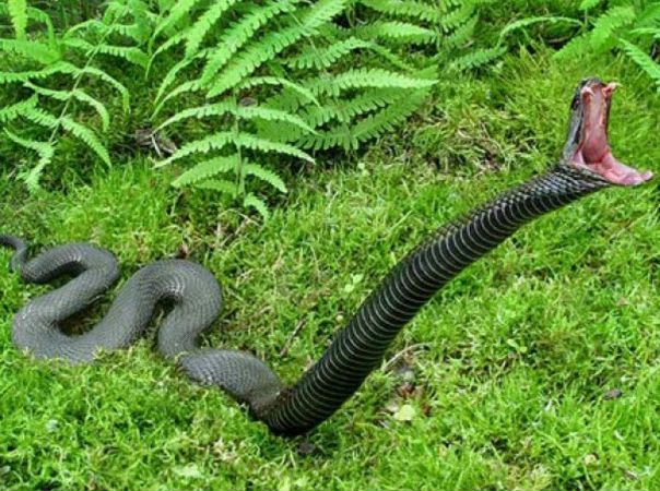 Перед атакой на врага черная тигровая змея приподнимает голову.