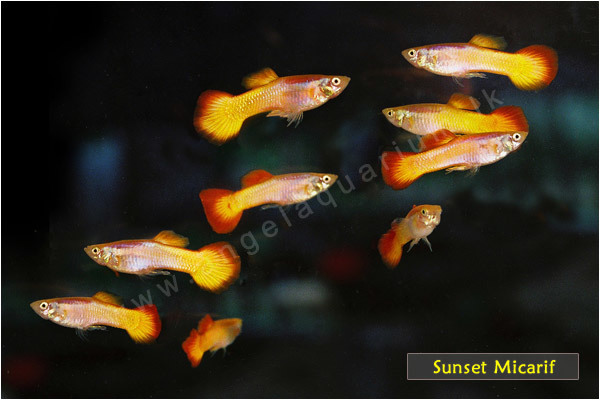 Пецилия сансет является селекционной породой. Цвет тела красный или оранжевый, с переходом одного цвета в другой. Еще эту морфу пецилии называют — солнечной или закат.