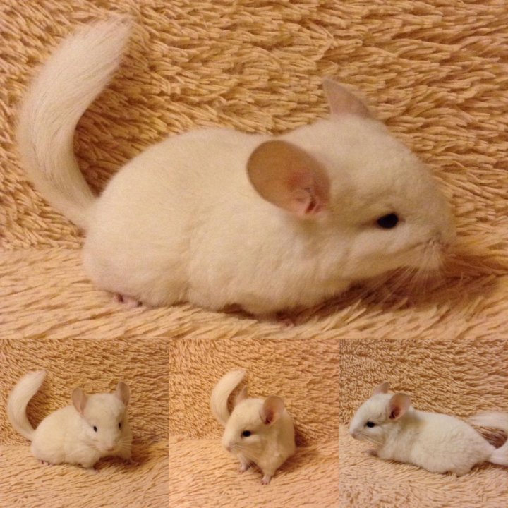 Этот цвет не является редкостью, но качественные белые фиалки трудно найти. Нижняя левая фотография любезно предоставлена Бобби Шульц, нижняя центральная фотография любезно предоставлена Humble Acres Chinchillas, а две правые фотографии любезно предоставлены Golden Chinchillas.