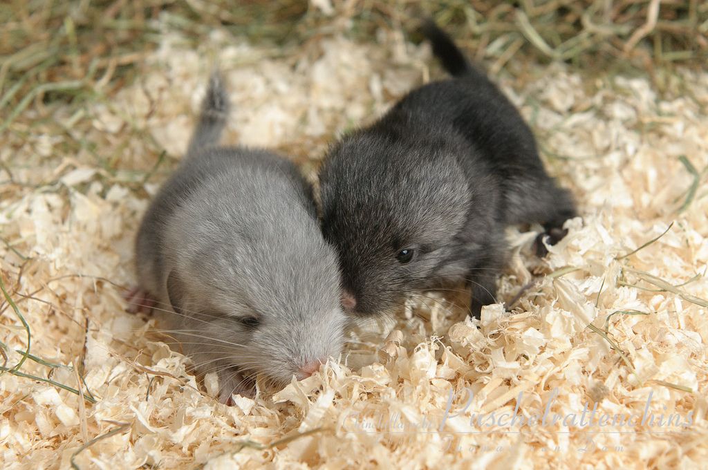 Малыши появляются на свет самостоятельными, они покрыты шерстью, с открытыми глазами, зубами и в состоянии бегать. Поначалу у самки нет молока, оно притекает через 2 – 5 дней. Новорожденные до этого момента рассасывают соски и пьют молозиво. Сосков у шиншиллы шесть, но рабочих только четыре. Рождение четырех шиншиллят редкое явление, в нашем питомнике таких случаев не бывало. Первые дни детишки теряют в весе до появления молока у самки, а начинают набирать с лактацией. Далее шиншиллята растут, крепнут и в возрасте 2-х месяцев перестают сосать мать, становятся полностью самостоятельными.