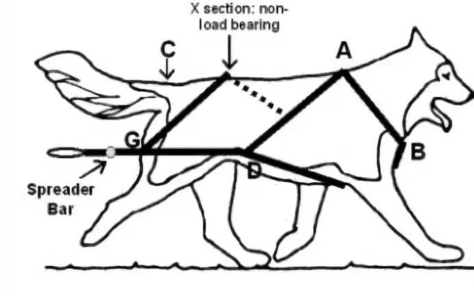 Ездовые шлейки обладают специальной конструкцией, в основе которой лежат два ремня, проходящих вдоль спины пса и крепятся в четырех точках.