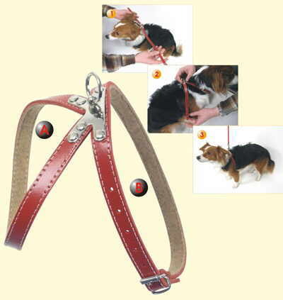 К ремням крепится веревка, соединяющая упряжку и питомца. Таким образом, нагрузка распределяется вдоль туловища равномерно, не сдавливая шейные позвонки, а задние лапы свободны.
