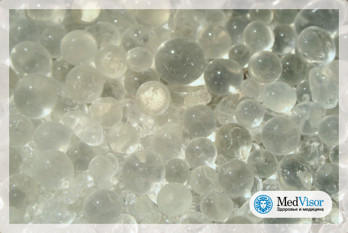 Силикагель выглядит как маленькие прозрачные круглые шарики или маленькие прозрачные камни.