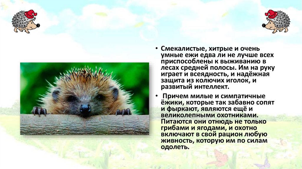Чем питаются ежи в природе? Ежи – всеядные животные, употребляющие в пищу, как разные фрукты (яблоки, груши, клубнику, малину, ежевику), грибы, мох, желуди; так и другую живность: крупных насекомых (жуков, пауков, саранчу, гусениц, дождевых червей), яйца птиц. Более крупные виды ежей могут охотиться на ящериц, лягушек, мышей. Будучи устойчивыми к ядам ежи нападают также и на ядовитых змей и скорпионов.
