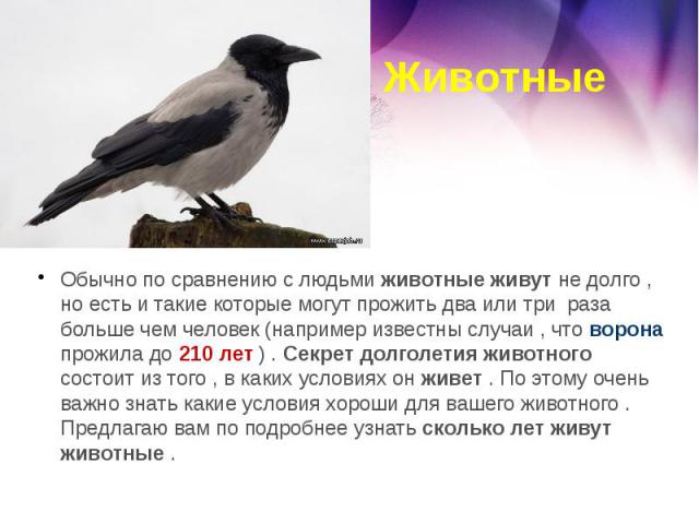 Нельзя ответить на вопрос о том, сколько живот вороны, однозначно. На продолжительность жизни влияют многие факторы, в том числе и качество, условия проживания.