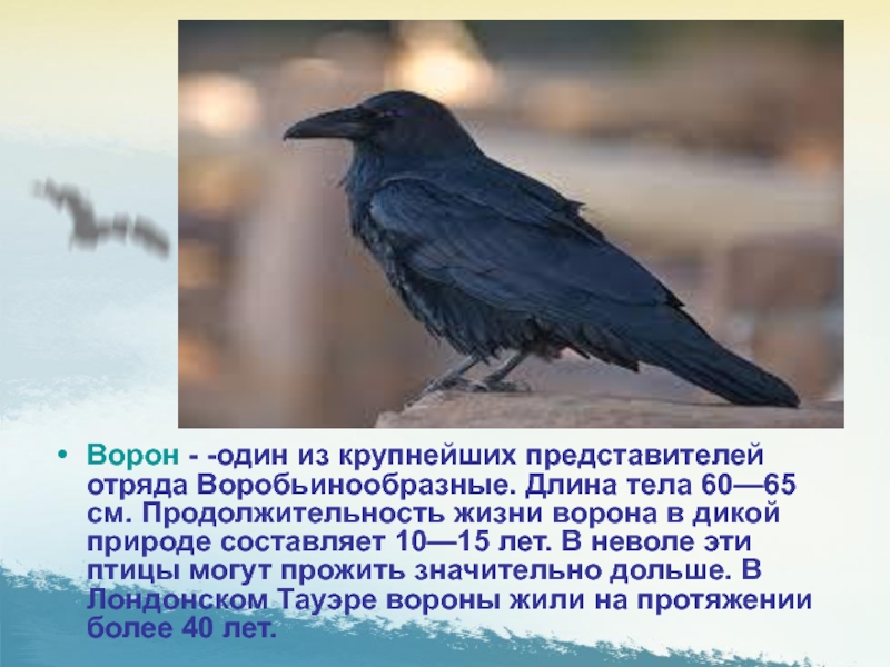 В неволе?В неволе продолжительность их жизни может резко увеличиться. Были сообщения о том, что вороны жили в неволе от 20 до 30 лет, а одна птица даже дожила до 59 лет!