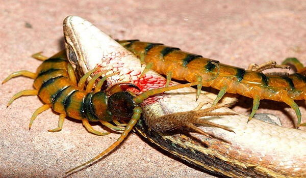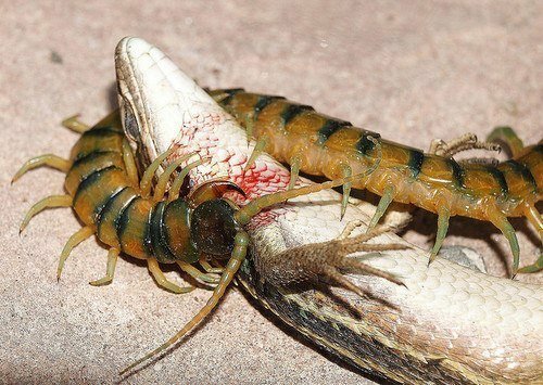 А вот сколопендра гигантская вполне себе может атаковать мелких ящериц, лягушек, птиц, маленьких змей и даже летучих мышей. Чтобы поймать последнюю, сколопендра, держась когтями за поверхность, забирается на потолок, где та спит, затем атакует летучую мышь передними когтями, одновременно обвивая жертву и вводя в нее яд.
