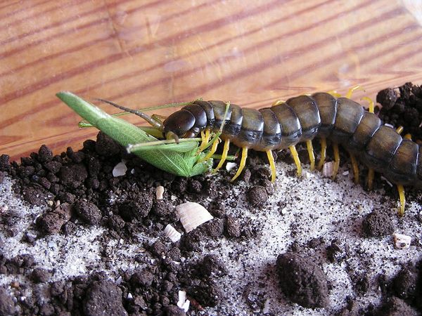 Сколопендра поймала кузнечика.