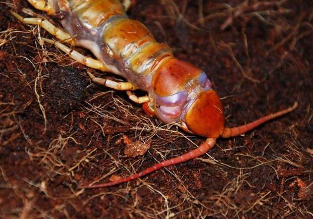 Эта огромных размеров многоножка медного цвета, достигает порой до 26 см в длину. Ее тело состоит из 20-23-х сегментов, покрытых крепким панцирем, на каждом из которых располагается по паре крепких и заостренных, как шипы, ножек. Первая пара ног располагается на голове и является еще и челюстями, вот уж природа затейница! Эти ногочелюсти соединены с особыми железами, которые выделяют сильнодействующий яд. Кроме этого, все тело и внутренности насекомого покрыты ядовитой слизью.