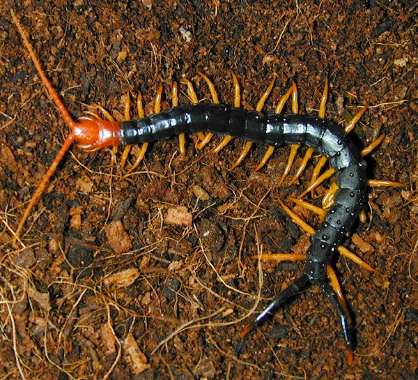 Голова состоит из головной пластины с глазки, двух усиков и ядовитых ногочелюстей, которые находятся под головой, но на самом деле являются частью первого тергита туловища. Ноги первого сегмента туловища трансформировались в ядовитые «клыки», которые используются при захвате добычи. Остальные сегменты туловища имеют по паре ног. Последняя пара ног направлены назад и используются при размножении, а также во время охоты на крупную добычу в качестве своеобразного якоря.