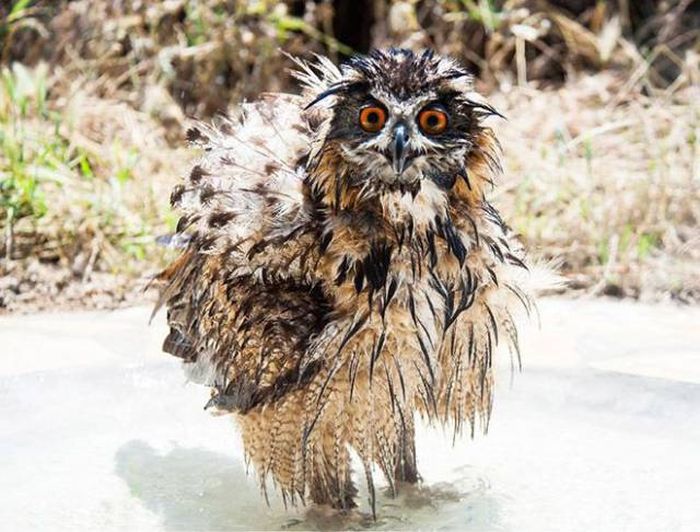 Интересно, любят ли совы мокнуть? Наверное, если это какой-нибудь запланированный способ почистить свои пёрышки, то вполне возможно. Однако у этих промокших и уже не таких величественных созданий наверняка не было желания промокнуть под дождём.