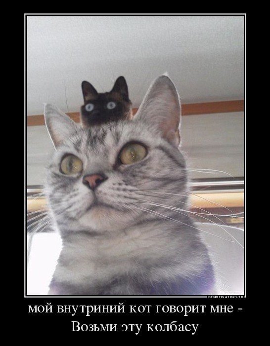 Любишь котиков? Котэ прекрасен и тоже любит тебя:) Здесь собраны самые лучшие и самые смешные демотиваторы про котэ. Наши демотиваторы, видео, картинки, комиксы, гифки, фото, истории и анекдоты про котов — часть огромной коллекции интернет-фольклора о наших любимых котах. Тут есть смешные, забавные, веселые и прикольные котэ, котики, коты, котята и кошки, манулы и тигры, собаки и еноты, рыбы и другие друзья котэ. Все эти шикарные кошки поднимут тебе настроение и повеселят!