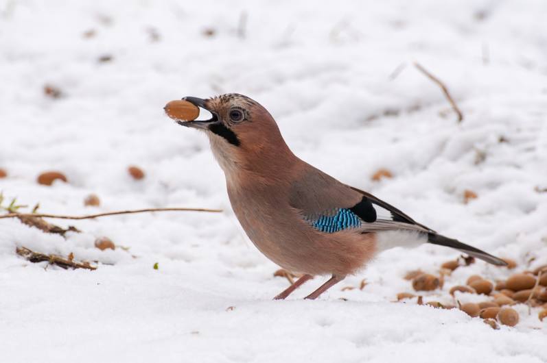 Орехи и желуди птица переносит не по одному, а одновременно по 7 штук. Для этого у нее имеется специальный мешок под языком. На зиму бережливая птаха может заготовить до 4 килограммов припасов. Зимой эти кладовые пригодятся не только ей – ими охотно пользуются белки и другие мелкие зверушки, оголодавшие за долгую зиму. В свою очередь, сойка может обнаружить припасы белок и разорить их.