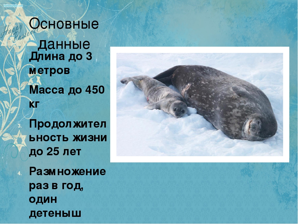 Тюлень принадлежит к млекопитающим. Он хищное животное. Его Родиной является Антарктида. Данное животное часто можно встретить в морях, впадающих в Северный Ледовитый океан. Насчитывают 20 видов этих животных.