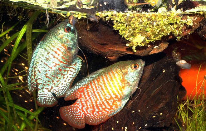 Гурами входят в семейство лабиринтовых. Очень подвижные рыбки, а новый объект в аквариуме вызывает у них интерес.