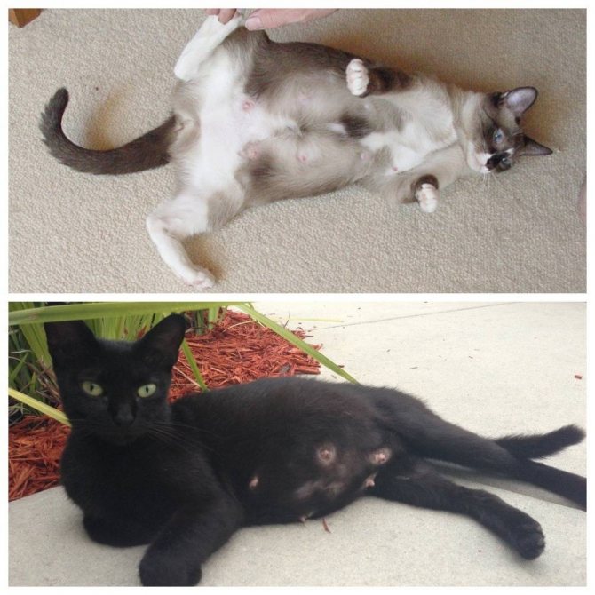 - Потемнение сосков. Одним из первых признаков беременности кошки является потемнение сосков. «Примерно через 15-18 дней кошачьей беременности вы можете заметить, что соски вашего питомца станут увеличенными и красными — это называется «порозовением», — говорит доктор Кристман.