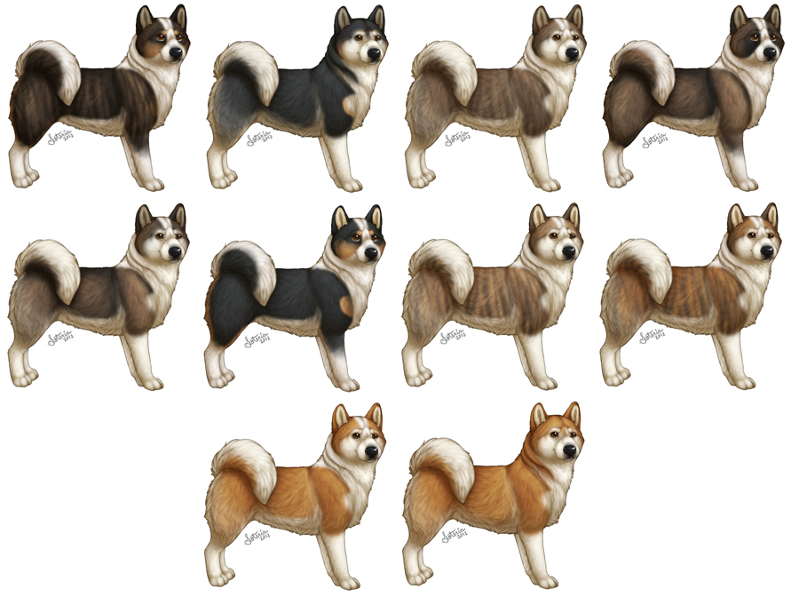 Разновидность стандартного окраса шерсти: все оттенки сплошного белого, кремового, красного, кунжутного (агути), красного кунжутного (красный агути), черного кунжутного (черный агути) или черного и подпалого/кремового пойнтов. Все окрасы должны иметь Ураджиро (бело-кремовые пойнты и нижняя сторона). Уражиро (от кремового до белого цвета живота) требуется на следующих участках для всех окрасов шерсти: по бокам морды, на щеках, внутри ушей, на нижней челюсти и верхней части горла, на внутренней стороне ног, на животе, вокруг анальное отверстие и вентральная сторона хвоста. Треугольники на груди и точки над глазами и на щеках необязательны.