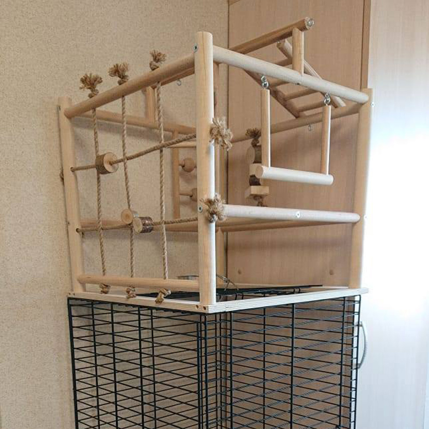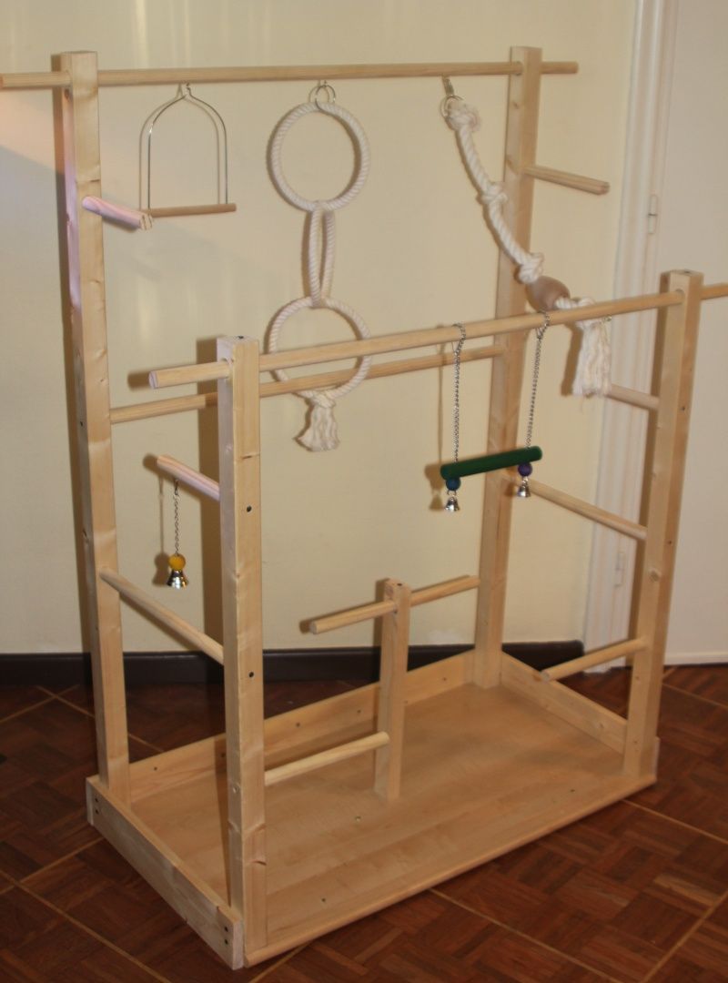 Если нужно сделать площадку самостоятельно, то, определяясь с высотой элементов, необходимо учитывать, что попугай должен иметь возможность свободно расправлять крылья, висеть вниз головой и перелетать с одного элемента на другой.