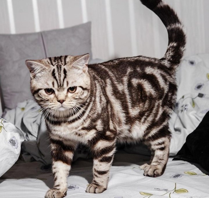 Хвостик также «окольцован». На лбу полосы складываются в букву «М». От глаз по щекам кошки расходится причудливый узор в форме бабочки. По всему тельцу – равномерные полоски.