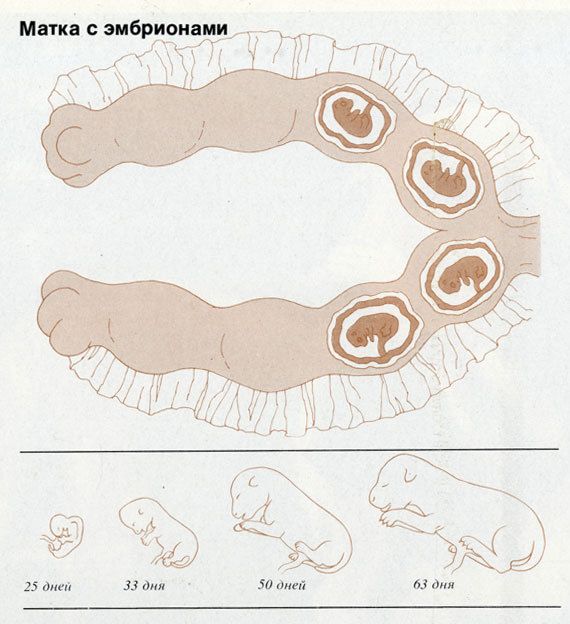 Доктор Джерри Кляйн, главный ветеринарный врач AKC, объясняет, что в течение первого месяца беременности оплодотворенные яйца попадают в рог матки, где они встраиваются в слизистую оболочку примерно через 15-18 дней. По данным Merck, рост плода происходит быстро на ранних сроках беременности, и эти опухоли удваиваются в диаметре каждые 7 дней.