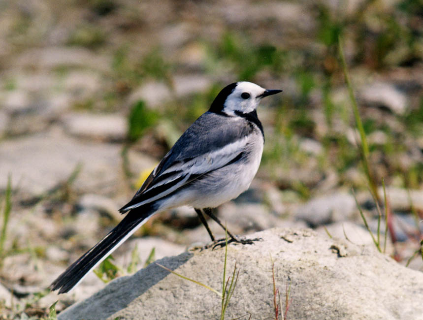 Сверху и снизу маленькой головы белой трясогузки расположены пятна, черного цвета. Оперение – черно-белое, спинка — серая. На каждом темном крыле расположено по две белых полосы.