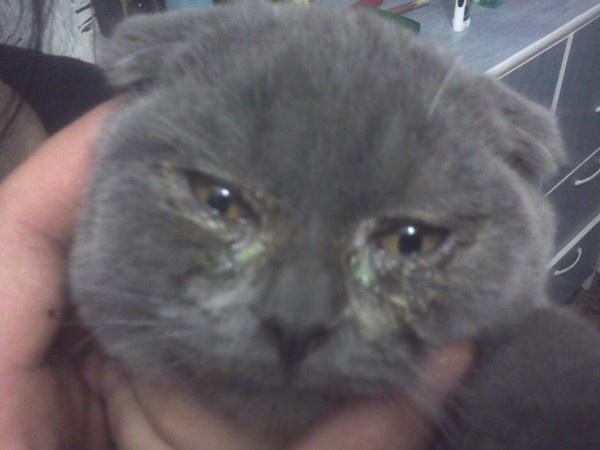 В основном он проявляется на двух глазах, кошка становится угнетённой, болезненной, веки становятся горячими. Выделения гноя жидкие, потом становятся гуще.